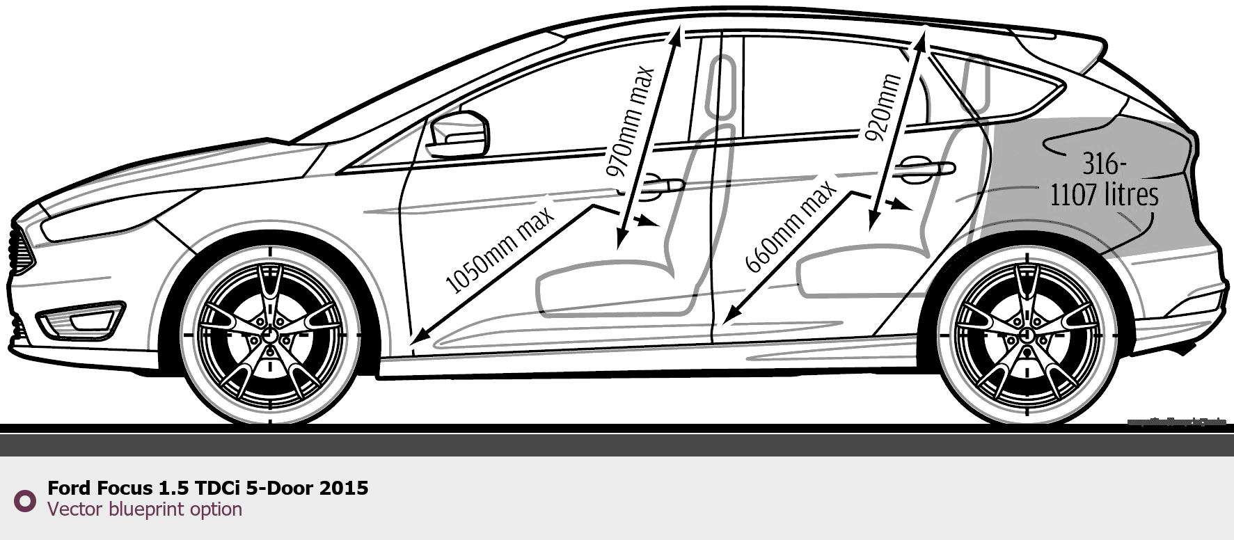 Raster blueprint of the 2015 Ford Focus 1.5 TDCi 5-Door Tag. This free downloadable image can be used for graphic projects, digital design, and 3D modeling. The file provides accurate exterior proportions of the vehicle. Model year: 2015. Body type: Tag.