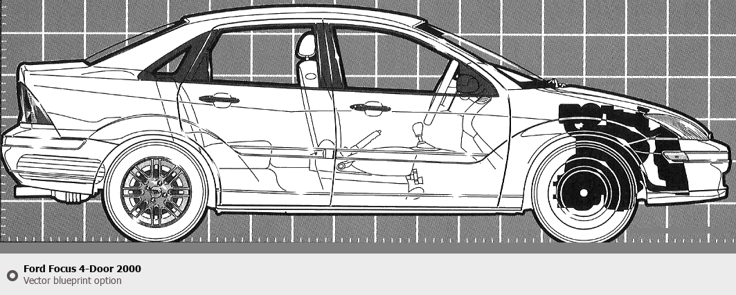 Raster blueprint of the 2000 Ford Focus 4-Door Tag. This free downloadable image can be used for graphic projects, digital design, and 3D modeling. The file provides accurate exterior proportions of the vehicle. Model year: 2000. Body type: Tag.