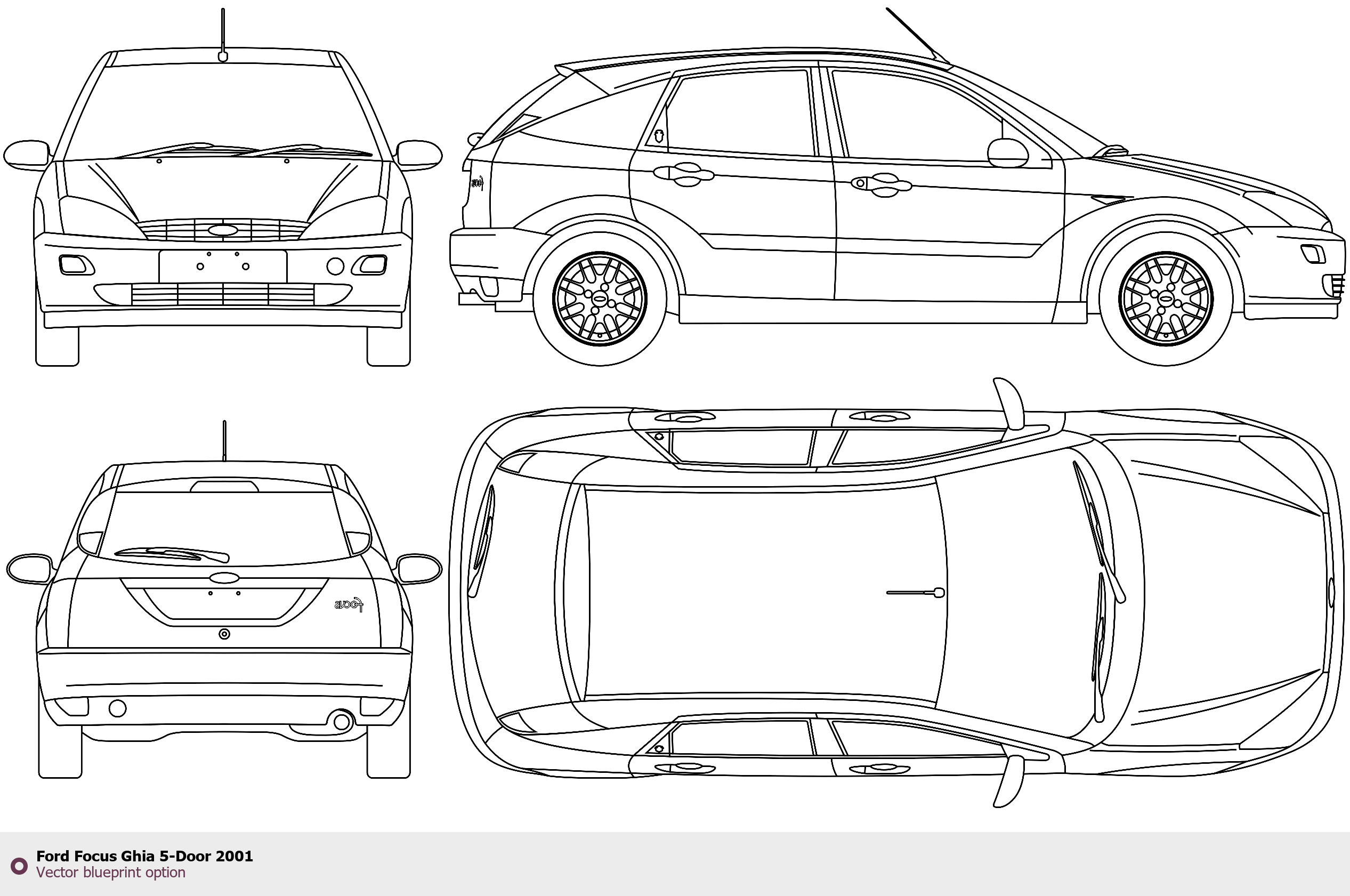 Raster blueprint of the 2001 Ford Focus Ghia 5-Door Tag. This free downloadable image can be used for graphic projects, digital design, and 3D modeling. The file provides accurate exterior proportions of the vehicle. Model year: 2001. Body type: Tag.