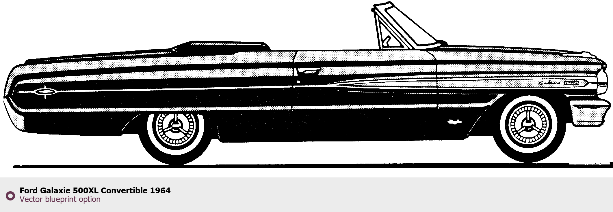 Raster blueprint of the 1964 Ford Galaxie 500XL Convertible Cabriolet. This free downloadable image can be used for graphic projects, digital design, and 3D modeling. The file provides accurate exterior proportions of the vehicle. Model year: 1964. Body type: Cabriolet.