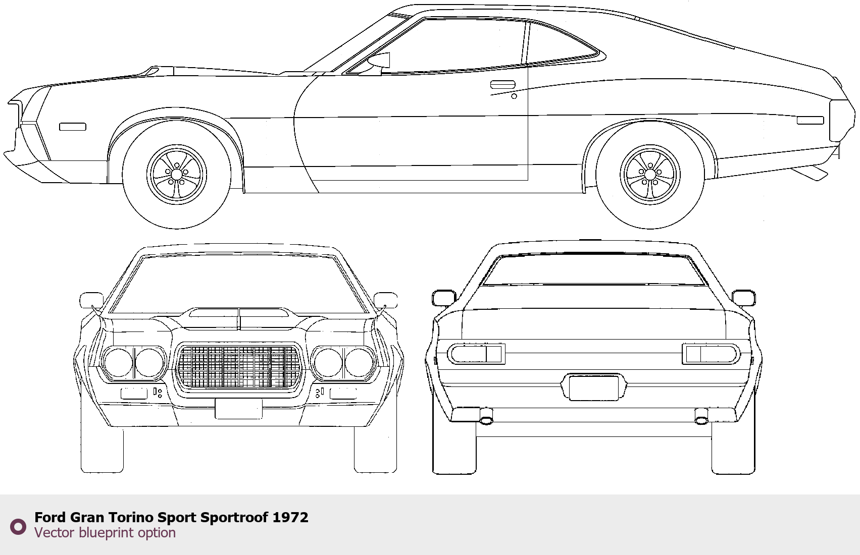 Raster blueprint of the 1972 Ford Gran Torino Sport Sportroof Tag. This free downloadable image can be used for graphic projects, digital design, and 3D modeling. The file provides accurate exterior proportions of the vehicle. Model year: 1972. Body type: Tag.