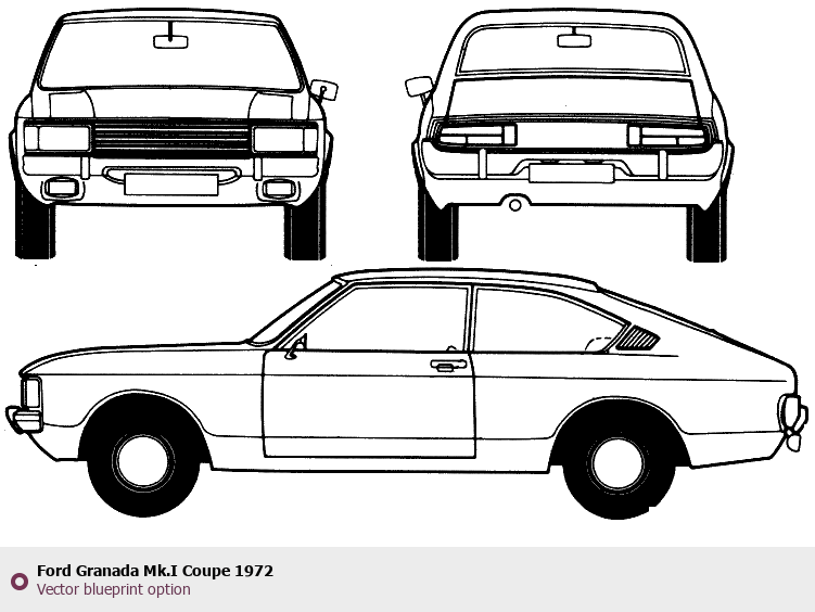 Raster blueprint of the 1972 Ford Granada Mk.I Coupe Coupe. This free downloadable image can be used for graphic projects, digital design, and 3D modeling. The file provides accurate exterior proportions of the vehicle. Model year: 1972. Body type: Coupe.