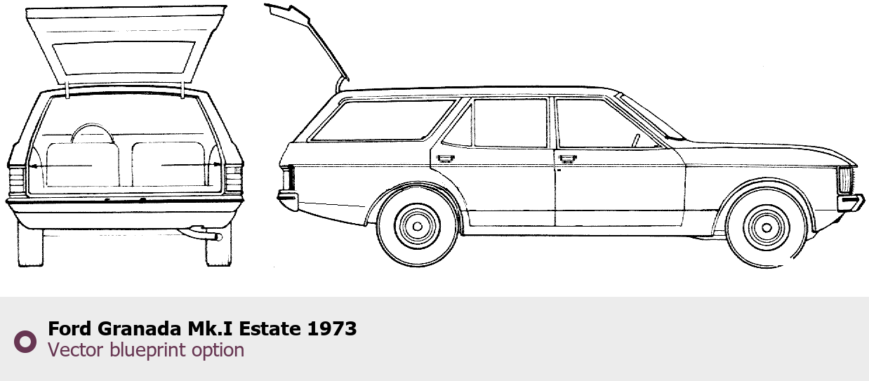Raster blueprint of the 1973 Ford Granada Mk.I Estate Wagon. This free downloadable image can be used for graphic projects, digital design, and 3D modeling. The file provides accurate exterior proportions of the vehicle. Model year: 1973. Body type: Wagon.