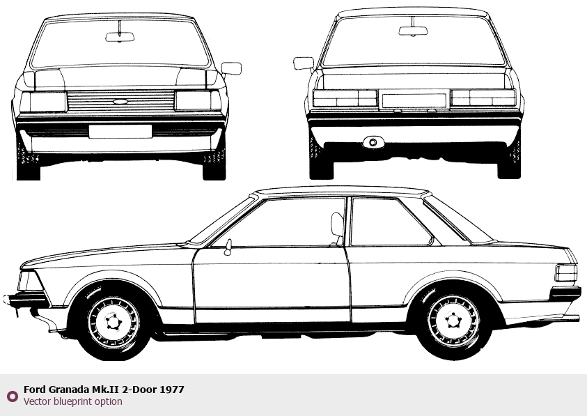 Raster blueprint of the 1977 Ford Granada Mk.II 2-Door Tag. This free downloadable image can be used for graphic projects, digital design, and 3D modeling. The file provides accurate exterior proportions of the vehicle. Model year: 1977. Body type: Tag.
