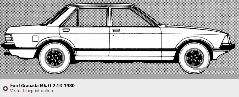 Raster blueprint of the 1980 Ford Granada Mk.II 2.1D Tag. This free downloadable image can be used for graphic projects, digital design, and 3D modeling. The file provides accurate exterior proportions of the vehicle. Model year: 1980. Body type: Tag.