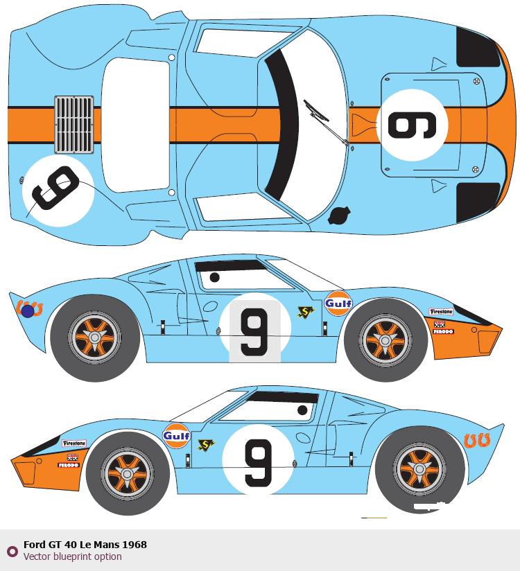 Raster blueprint of the 1968 Ford GT 40 Le Mans Coupe. This free downloadable image can be used for graphic projects, digital design, and 3D modeling. The file provides accurate exterior proportions of the vehicle. Model year: 1968. Body type: Coupe.