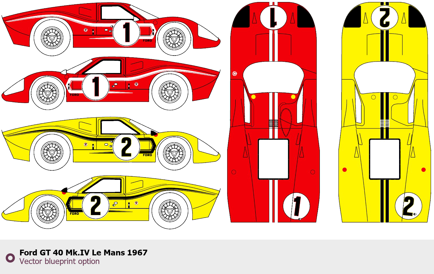 Raster blueprint of the 1967 Ford GT 40 Mk.IV Le Mans Coupe. This free downloadable image can be used for graphic projects, digital design, and 3D modeling. The file provides accurate exterior proportions of the vehicle. Model year: 1967. Body type: Coupe.
