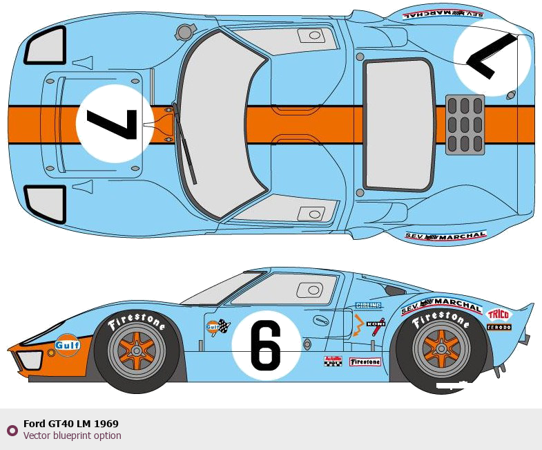 Raster blueprint of the 1969 Ford GT40 LM Coupe. This free downloadable image can be used for graphic projects, digital design, and 3D modeling. The file provides accurate exterior proportions of the vehicle. Model year: 1969. Body type: Coupe.