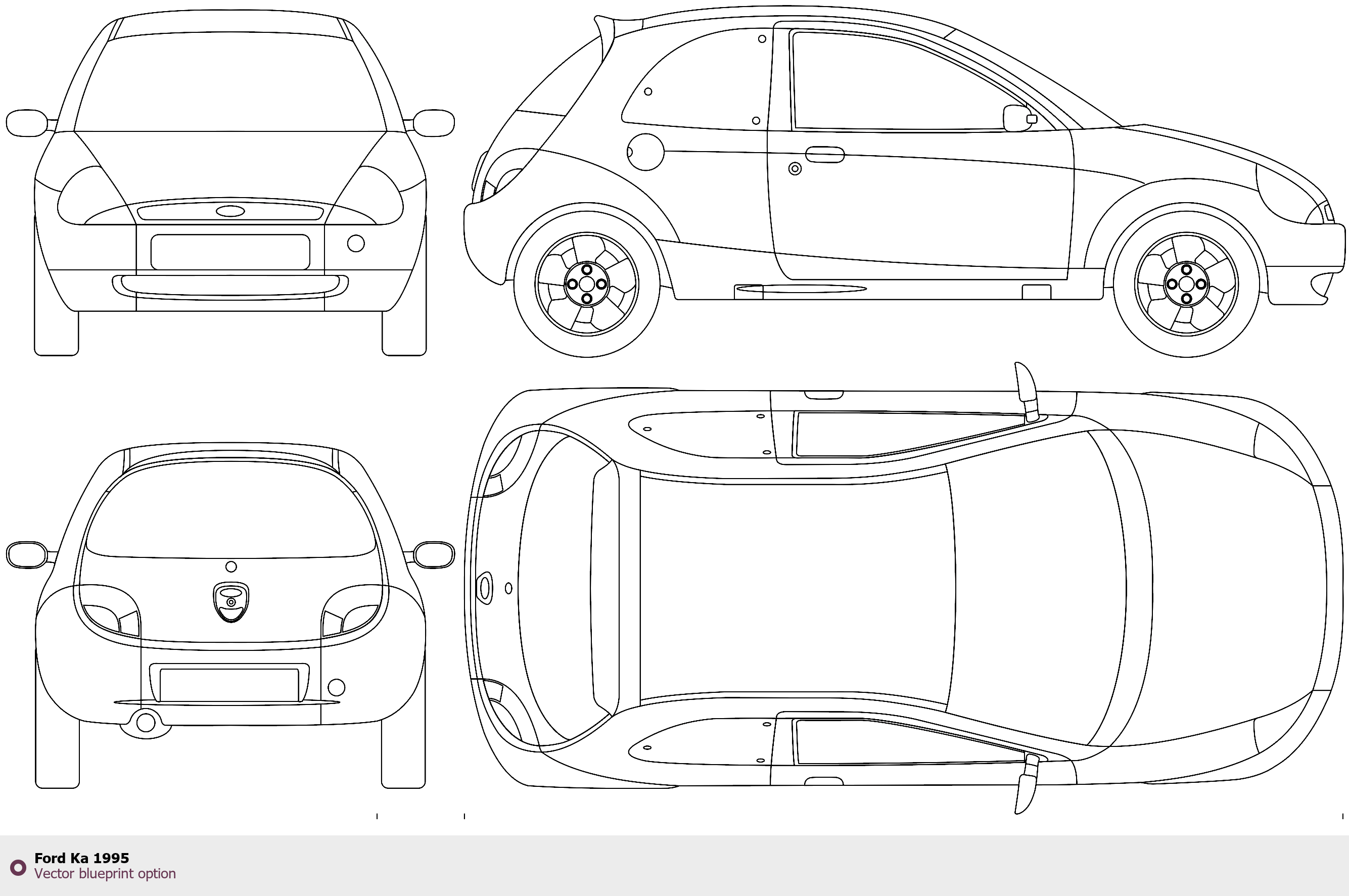 Raster blueprint of the 1995 Ford Ka Hatchback. This free downloadable image can be used for graphic projects, digital design, and 3D modeling. The file provides accurate exterior proportions of the vehicle. Model year: 1995. Body type: Hatchback.