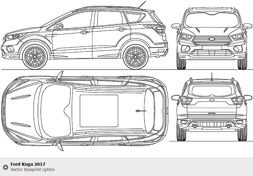Raster blueprint of the 2017 Ford Kuga SUV. This free downloadable image can be used for graphic projects, digital design, and 3D modeling. The file provides accurate exterior proportions of the vehicle. Model year: 2017. Body type: SUV.