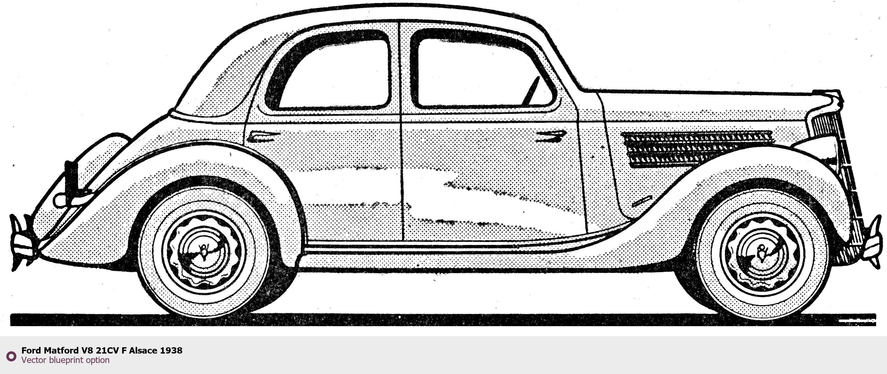 Raster blueprint of the 1938 Ford Matford V8 21CV F Alsace Coupe. This free downloadable image can be used for graphic projects, digital design, and 3D modeling. The file provides accurate exterior proportions of the vehicle. Model year: 1938. Body type: Coupe.