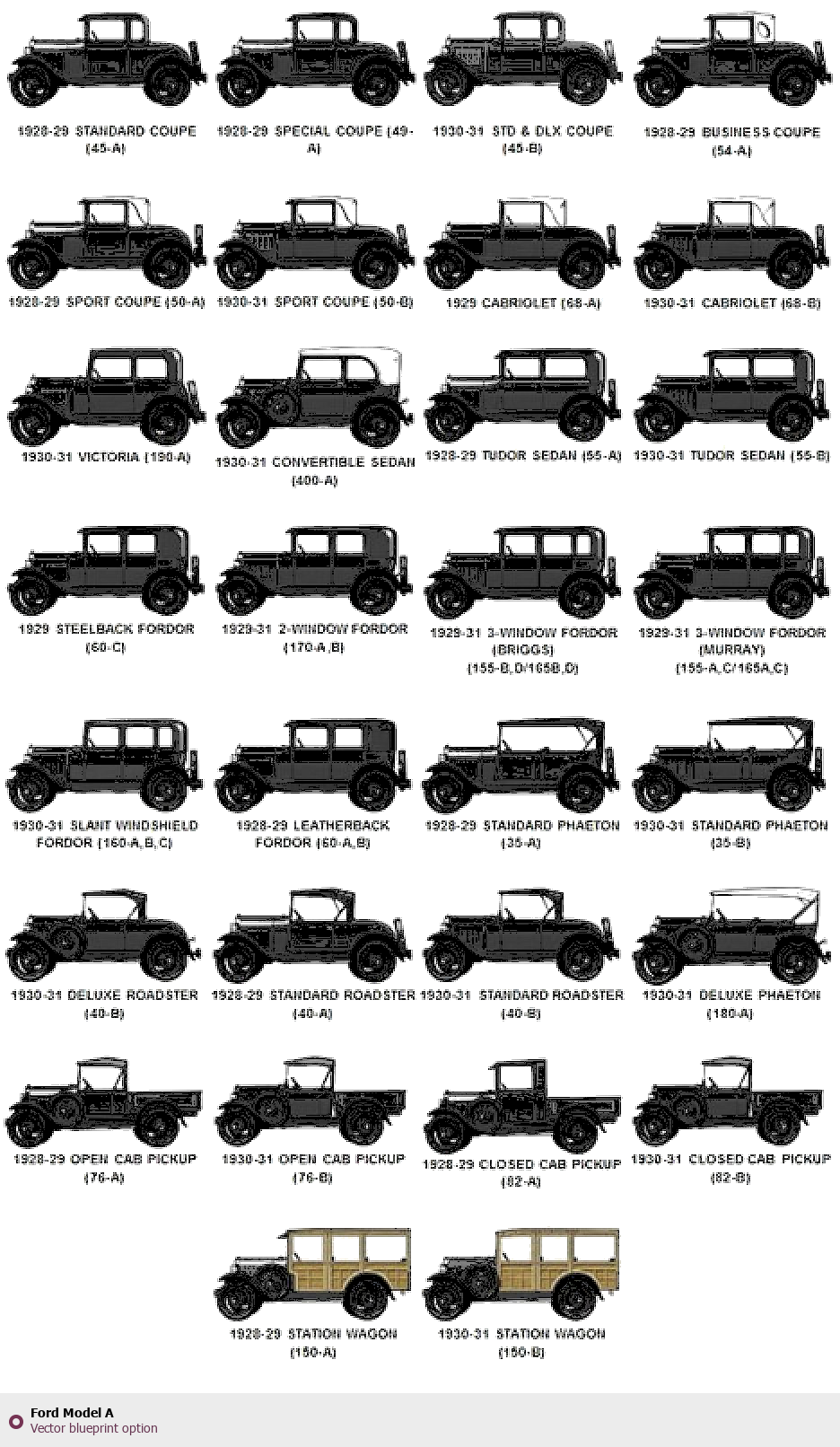Raster blueprint of the Ford Model A Coupe. This free downloadable image can be used for graphic projects, digital design, and 3D modeling. The file provides accurate exterior proportions of the vehicle. Body type: Coupe.