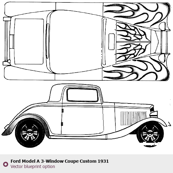 Raster blueprint of the 1931 Ford Model A 3-Window Coupe Custom Coupe. This free downloadable image can be used for graphic projects, digital design, and 3D modeling. The file provides accurate exterior proportions of the vehicle. Model year: 1931. Body type: Coupe.