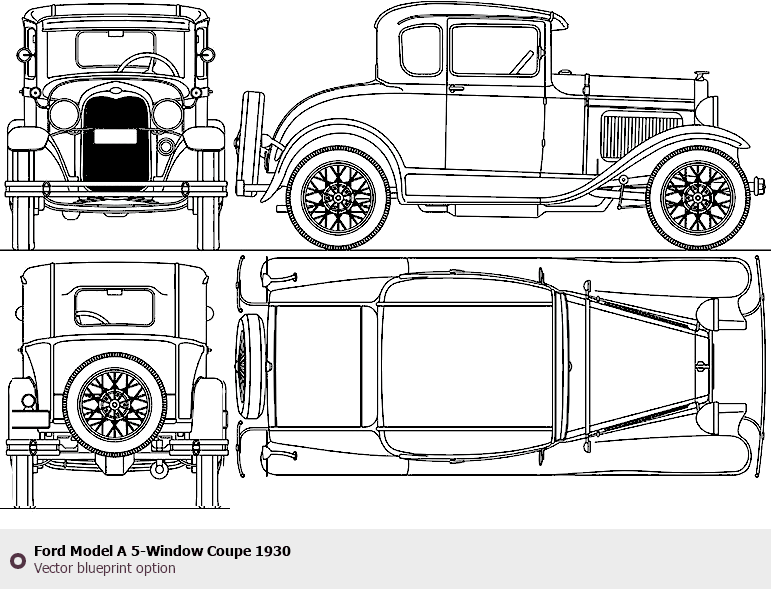 Raster blueprint of the 1930 Ford Model A 5-Window Coupe Coupe. This free downloadable image can be used for graphic projects, digital design, and 3D modeling. The file provides accurate exterior proportions of the vehicle. Model year: 1930. Body type: Coupe.