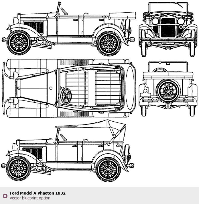 Raster blueprint of the 1932 Ford Model A Phaeton Coupe. This free downloadable image can be used for graphic projects, digital design, and 3D modeling. The file provides accurate exterior proportions of the vehicle. Model year: 1932. Body type: Coupe.