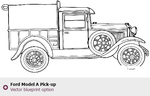 Raster blueprint of the Ford Model A Pick-up Coupe. This free downloadable image can be used for graphic projects, digital design, and 3D modeling. The file provides accurate exterior proportions of the vehicle. Body type: Coupe.