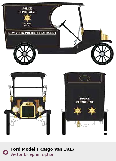 Raster blueprint of the 1917 Ford Model T Cargo Van Van. This free downloadable image can be used for graphic projects, digital design, and 3D modeling. The file provides accurate exterior proportions of the vehicle. Model year: 1917. Body type: Van.