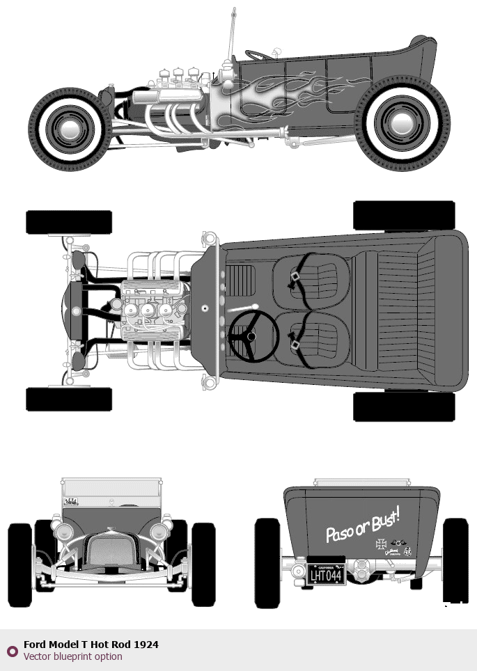 Raster blueprint of the 1924 Ford Model T Hot Rod Tag. This free downloadable image can be used for graphic projects, digital design, and 3D modeling. The file provides accurate exterior proportions of the vehicle. Model year: 1924. Body type: Tag.