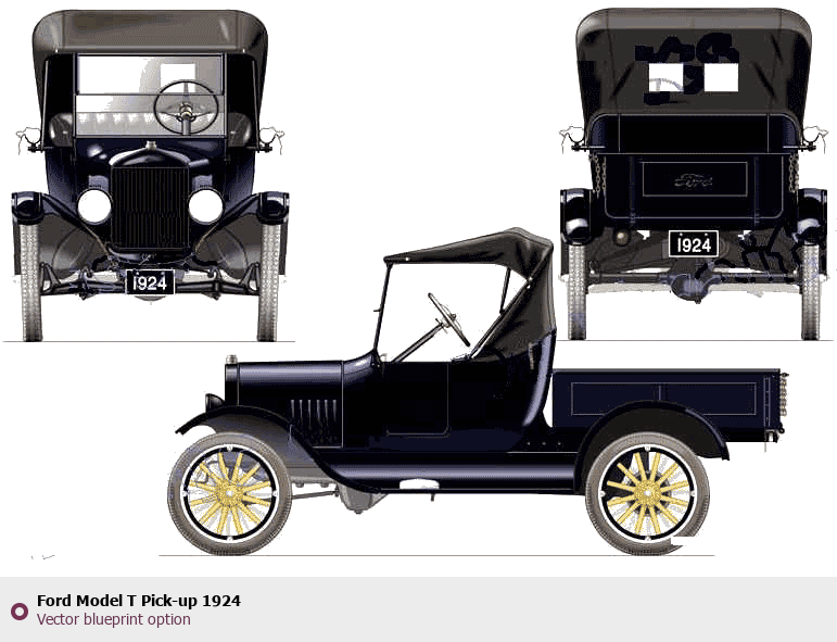 Raster blueprint of the 1924 Ford Model T Pick-up Pickup Truck. This free downloadable image can be used for graphic projects, digital design, and 3D modeling. The file provides accurate exterior proportions of the vehicle. Model year: 1924. Body type: Pickup Truck.