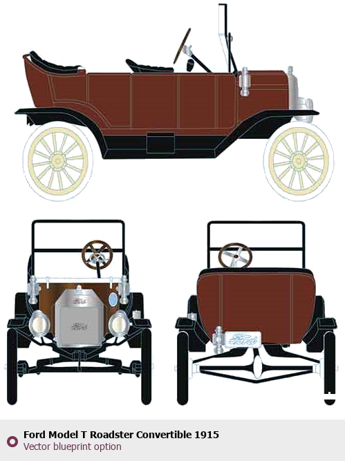 Raster blueprint of the 1915 Ford Model T Roadster Convertible Cabriolet. This free downloadable image can be used for graphic projects, digital design, and 3D modeling. The file provides accurate exterior proportions of the vehicle. Model year: 1915. Body type: Cabriolet.