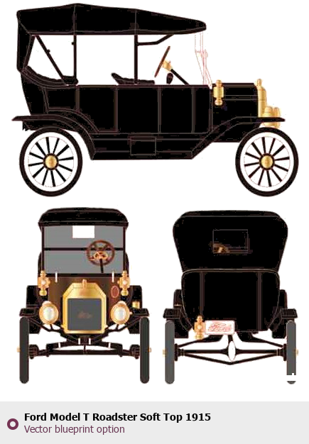 Raster blueprint of the 1915 Ford Model T Roadster Soft Top Roadster. This free downloadable image can be used for graphic projects, digital design, and 3D modeling. The file provides accurate exterior proportions of the vehicle. Model year: 1915. Body type: Roadster.
