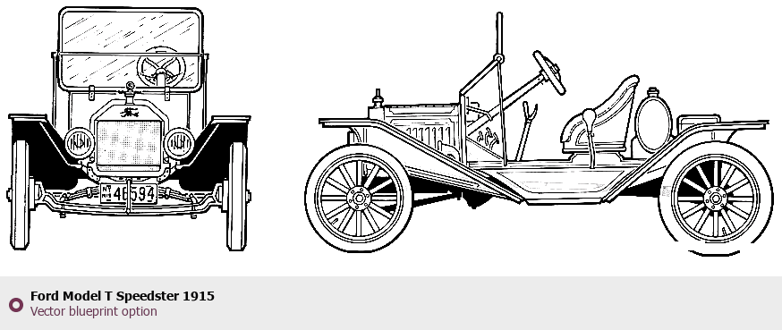 Raster blueprint of the 1915 Ford Model T Speedster Tag. This free downloadable image can be used for graphic projects, digital design, and 3D modeling. The file provides accurate exterior proportions of the vehicle. Model year: 1915. Body type: Tag.