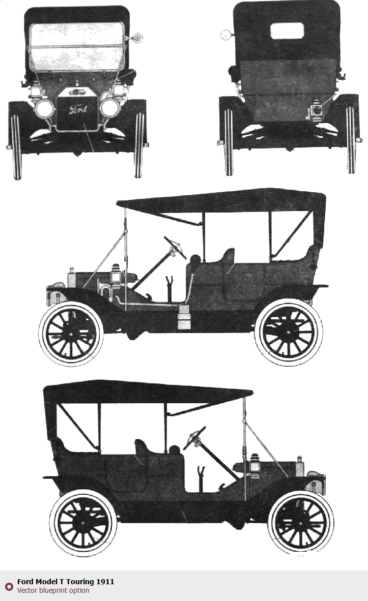 Raster blueprint of the 1911 Ford Model T Touring Wagon. This free downloadable image can be used for graphic projects, digital design, and 3D modeling. The file provides accurate exterior proportions of the vehicle. Model year: 1911. Body type: Wagon.