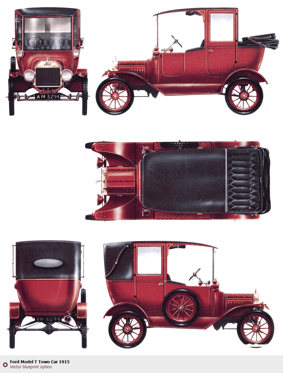 Raster blueprint of the 1915 Ford Model T Town Car Tag. This free downloadable image can be used for graphic projects, digital design, and 3D modeling. The file provides accurate exterior proportions of the vehicle. Model year: 1915. Body type: Tag.