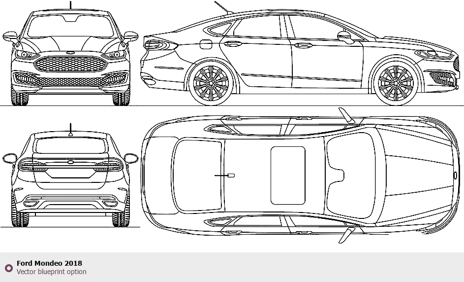 Raster blueprint of the 2018 Ford Mondeo Tag. This free downloadable image can be used for graphic projects, digital design, and 3D modeling. The file provides accurate exterior proportions of the vehicle. Model year: 2018. Body type: Tag.