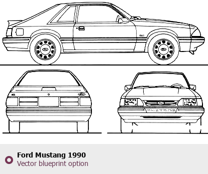 Raster blueprint of the 1990 Ford Mustang Tag. This free downloadable image can be used for graphic projects, digital design, and 3D modeling. The file provides accurate exterior proportions of the vehicle. Model year: 1990. Body type: Tag.