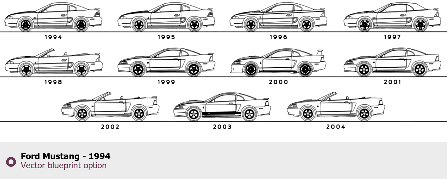 Raster blueprint of the 1994 Ford Mustang - Tag. This free downloadable image can be used for graphic projects, digital design, and 3D modeling. The file provides accurate exterior proportions of the vehicle. Model year: 1994. Body type: Tag.