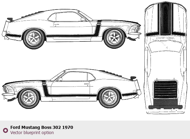 Raster blueprint of the 1970 Ford Mustang Boss 302 Tag. This free downloadable image can be used for graphic projects, digital design, and 3D modeling. The file provides accurate exterior proportions of the vehicle. Model year: 1970. Body type: Tag.