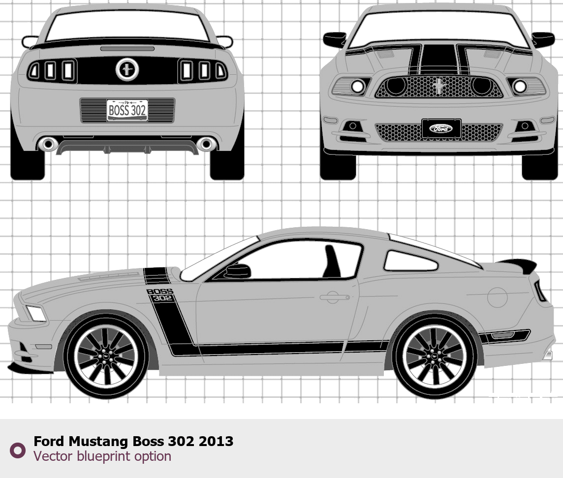 Raster blueprint of the 2013 Ford Mustang Boss 302 Tag. This free downloadable image can be used for graphic projects, digital design, and 3D modeling. The file provides accurate exterior proportions of the vehicle. Model year: 2013. Body type: Tag.