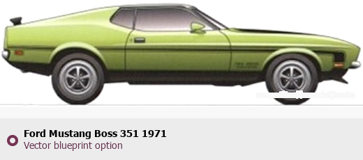 Raster blueprint of the 1971 Ford Mustang Boss 351 Tag. This free downloadable image can be used for graphic projects, digital design, and 3D modeling. The file provides accurate exterior proportions of the vehicle. Model year: 1971. Body type: Tag.