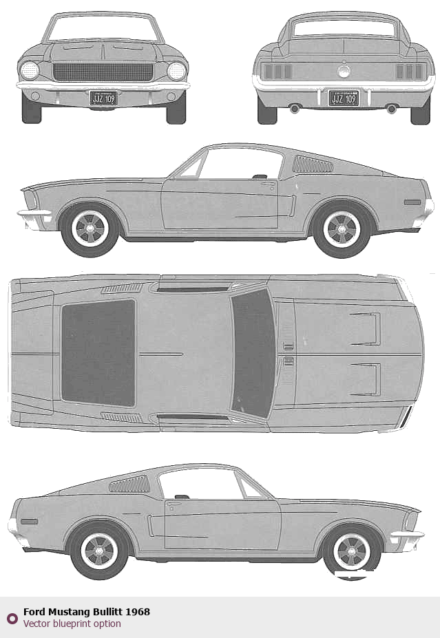 Raster blueprint of the 1968 Ford Mustang Bullitt Tag. This free downloadable image can be used for graphic projects, digital design, and 3D modeling. The file provides accurate exterior proportions of the vehicle. Model year: 1968. Body type: Tag.