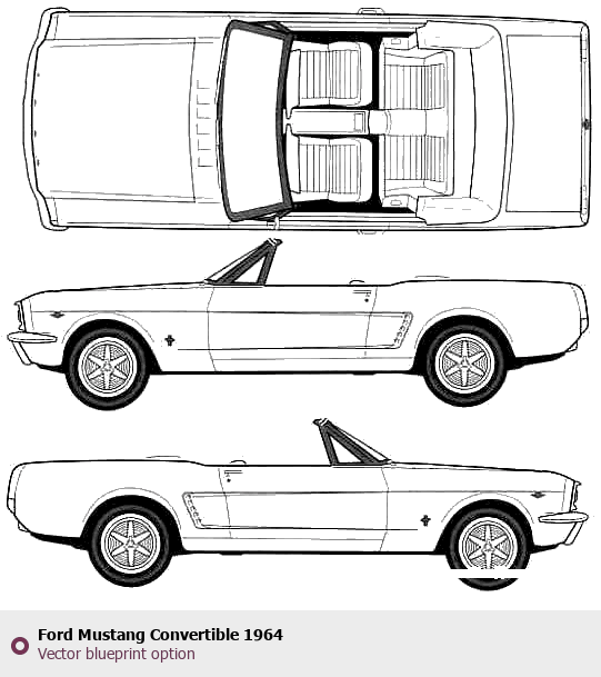Raster blueprint of the 1964 Ford Mustang Convertible Cabriolet. This free downloadable image can be used for graphic projects, digital design, and 3D modeling. The file provides accurate exterior proportions of the vehicle. Model year: 1964. Body type: Cabriolet.