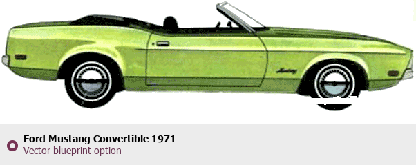 Raster blueprint of the 1971 Ford Mustang Convertible Cabriolet. This free downloadable image can be used for graphic projects, digital design, and 3D modeling. The file provides accurate exterior proportions of the vehicle. Model year: 1971. Body type: Cabriolet.