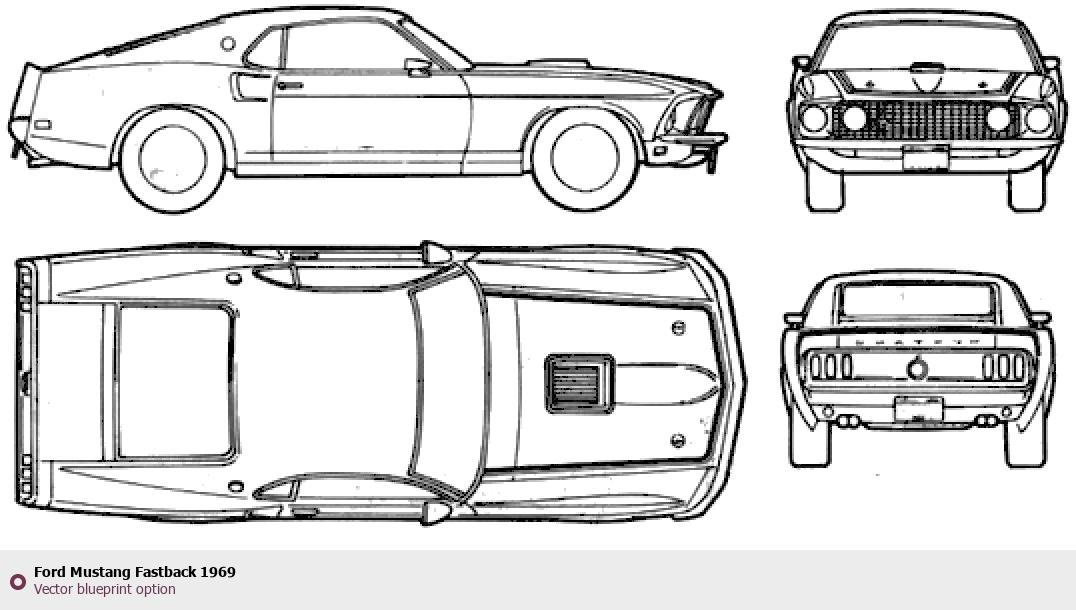 Raster blueprint of the 1969 Ford Mustang Fastback Tag. This free downloadable image can be used for graphic projects, digital design, and 3D modeling. The file provides accurate exterior proportions of the vehicle. Model year: 1969. Body type: Tag.