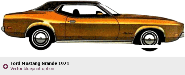 Raster blueprint of the 1971 Ford Mustang Grande Tag. This free downloadable image can be used for graphic projects, digital design, and 3D modeling. The file provides accurate exterior proportions of the vehicle. Model year: 1971. Body type: Tag.