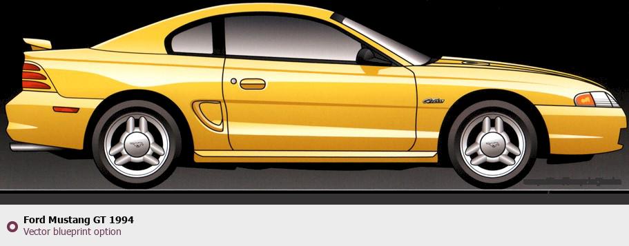 Raster blueprint of the 1994 Ford Mustang GT Tag. This free downloadable image can be used for graphic projects, digital design, and 3D modeling. The file provides accurate exterior proportions of the vehicle. Model year: 1994. Body type: Tag.