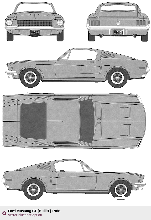 Raster blueprint of the 1968 Ford Mustang GT [Bullitt] Tag. This free downloadable image can be used for graphic projects, digital design, and 3D modeling. The file provides accurate exterior proportions of the vehicle. Model year: 1968. Body type: Tag.