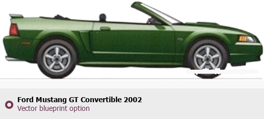 Raster blueprint of the 2002 Ford Mustang GT Convertible Cabriolet. This free downloadable image can be used for graphic projects, digital design, and 3D modeling. The file provides accurate exterior proportions of the vehicle. Model year: 2002. Body type: Cabriolet.