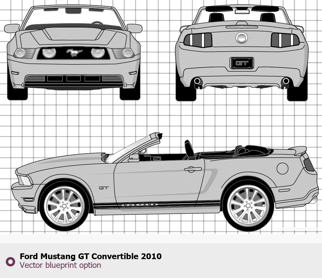Raster blueprint of the 2010 Ford Mustang GT Convertible Cabriolet. This free downloadable image can be used for graphic projects, digital design, and 3D modeling. The file provides accurate exterior proportions of the vehicle. Model year: 2010. Body type: Cabriolet.