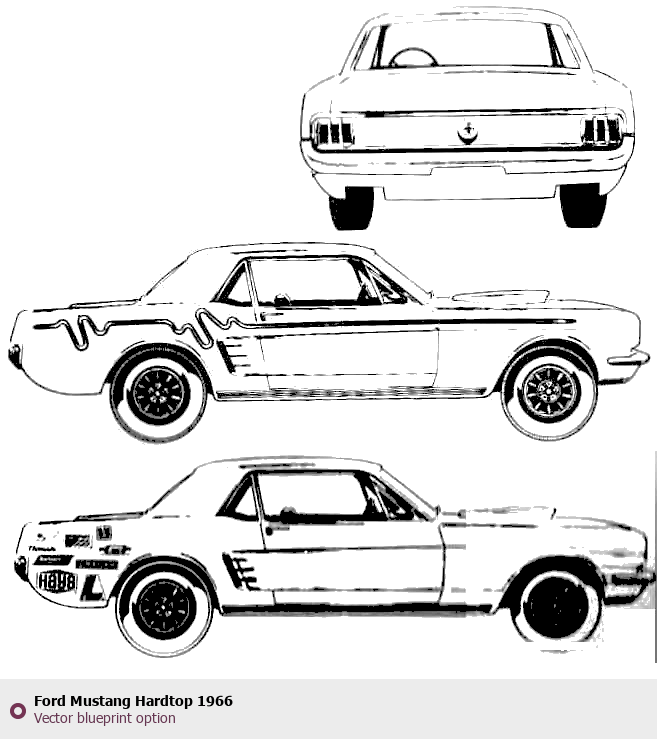 Raster blueprint of the 1966 Ford Mustang Hardtop Tag. This free downloadable image can be used for graphic projects, digital design, and 3D modeling. The file provides accurate exterior proportions of the vehicle. Model year: 1966. Body type: Tag.