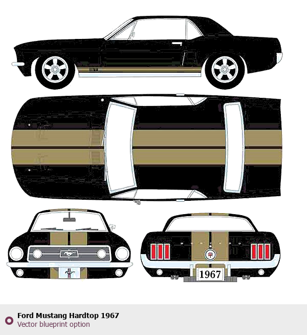 Raster blueprint of the 1967 Ford Mustang Hardtop Tag. This free downloadable image can be used for graphic projects, digital design, and 3D modeling. The file provides accurate exterior proportions of the vehicle. Model year: 1967. Body type: Tag.