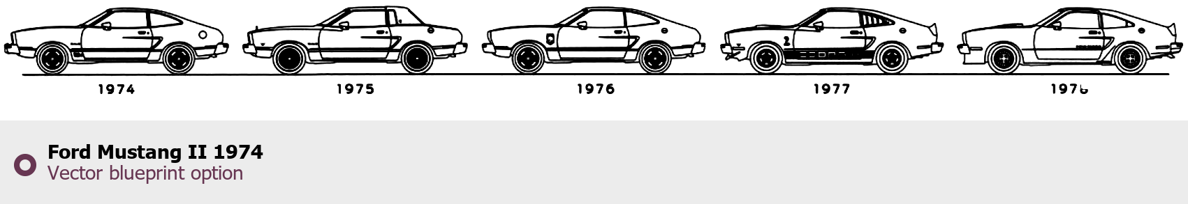 Raster blueprint of the 1974 Ford Mustang II Tag. This free downloadable image can be used for graphic projects, digital design, and 3D modeling. The file provides accurate exterior proportions of the vehicle. Model year: 1974. Body type: Tag.