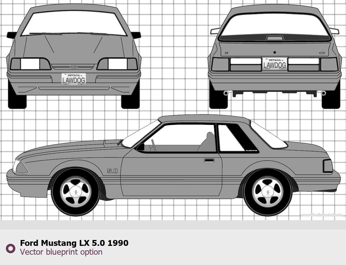 Raster blueprint of the 1990 Ford Mustang LX 5.0 Tag. This free downloadable image can be used for graphic projects, digital design, and 3D modeling. The file provides accurate exterior proportions of the vehicle. Model year: 1990. Body type: Tag.