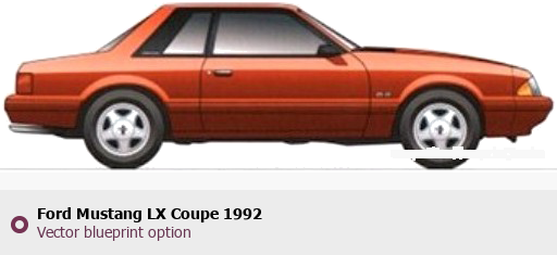 Raster blueprint of the 1992 Ford Mustang LX Coupe Coupe. This free downloadable image can be used for graphic projects, digital design, and 3D modeling. The file provides accurate exterior proportions of the vehicle. Model year: 1992. Body type: Coupe.