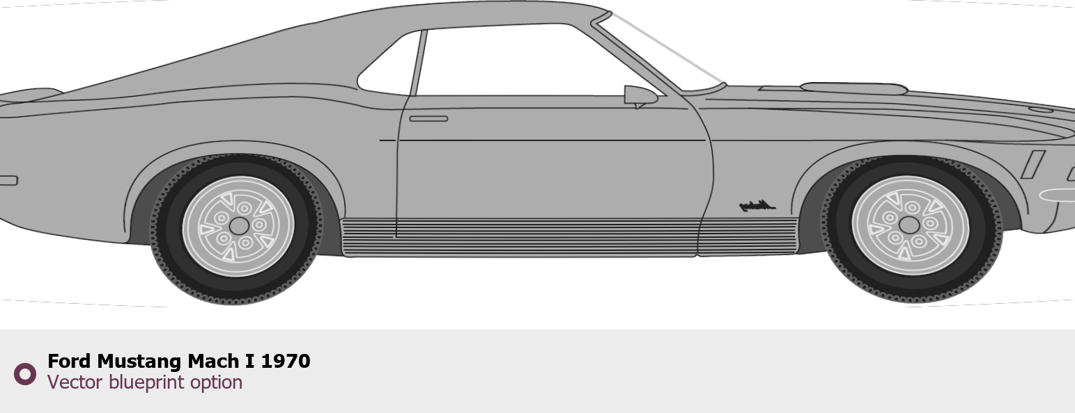 Raster blueprint of the 1970 Ford Mustang Mach I Tag. This free downloadable image can be used for graphic projects, digital design, and 3D modeling. The file provides accurate exterior proportions of the vehicle. Model year: 1970. Body type: Tag.