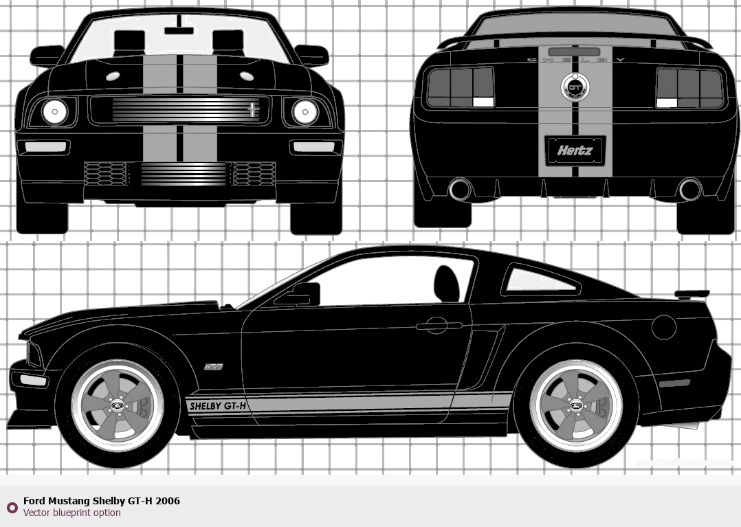Raster blueprint of the 2006 Ford Mustang Shelby GT-H Tag. This free downloadable image can be used for graphic projects, digital design, and 3D modeling. The file provides accurate exterior proportions of the vehicle. Model year: 2006. Body type: Tag.
